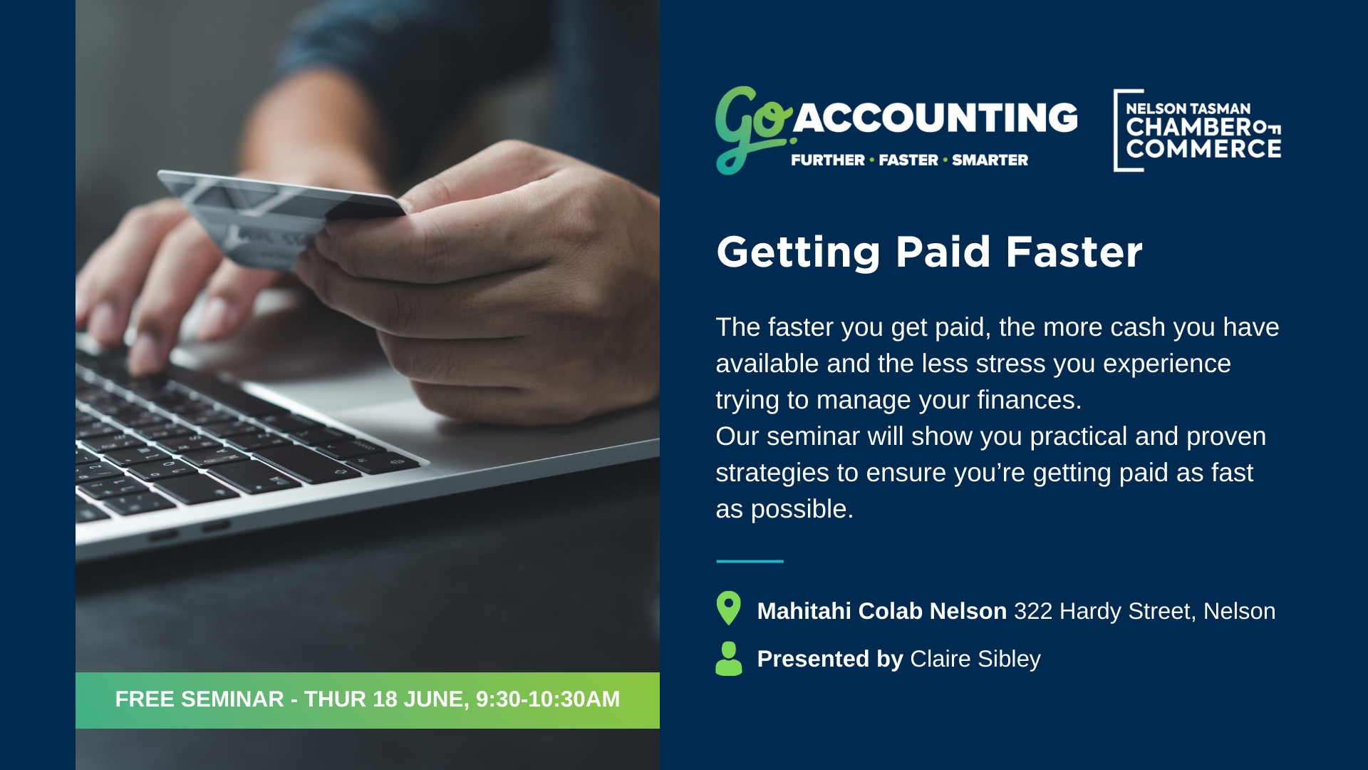 Mahitahi Colab, 322 Hardy Street, NelsonOur complimentary seminar, Getting Paid Faster, will show you practical and proven strategies to ensure you’re getting paid as fast as possible. Join us for this 60-minute seminar, where you’ll: